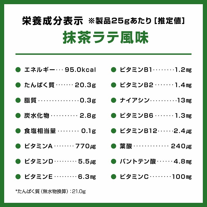 | 原材料名 | 分離ホエイたんぱく(イギリス製造)、乳等を主要原料とする食品、抹茶、粉末油脂、ほうじ茶粉末/香料、甘味料(ステビア、スクラロース、アセスルファムカリウム)、V.C、乳化剤、抽出V.E、ナイアシン、加工デンプン、二酸化ケイ素、パントテン酸Ca、V.B1、V.B6、V.B2、V.A、葉酸、V.D、V.B12、(一部に乳成分・大豆を含む) |